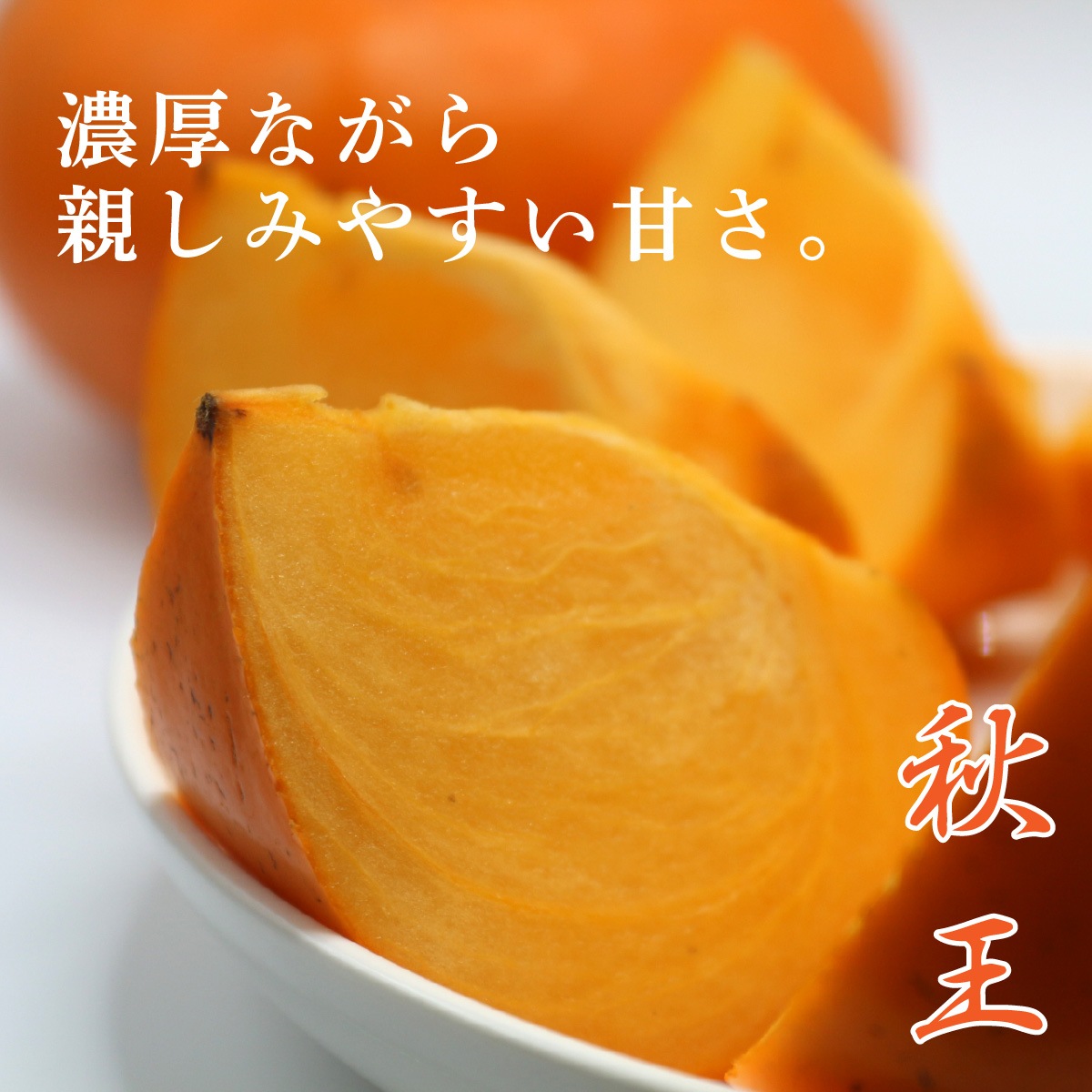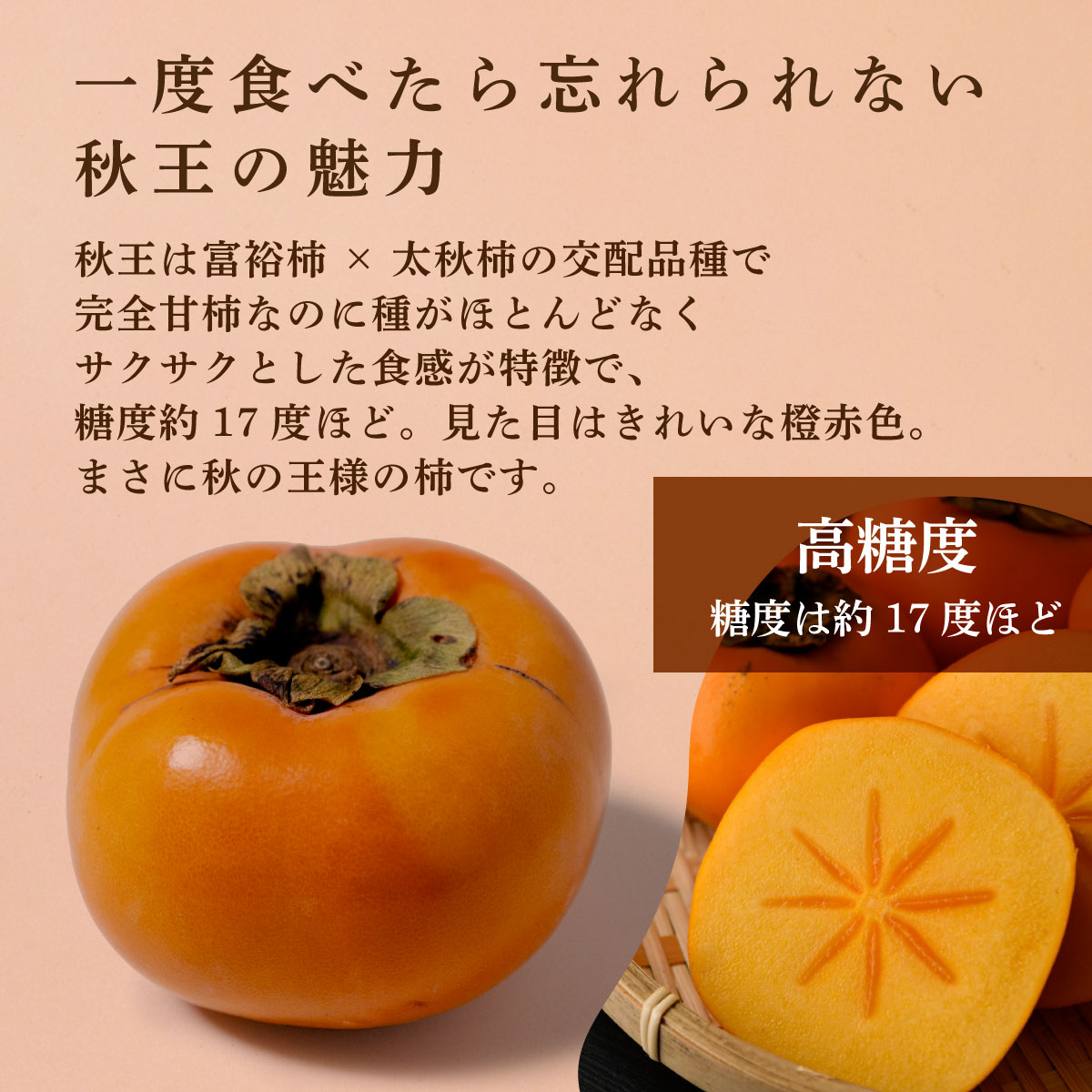秋王は「富有柿」と「太秋柿」を掛け合わせた交配品種。 完全甘柿でありながら種がほとんどなく、サクサクとした軽やかな食感と、糖度17度前後の上品な甘さが特長です。 見た目はつややかな橙赤色。ひと目で秋を感じる、美しい果実です。