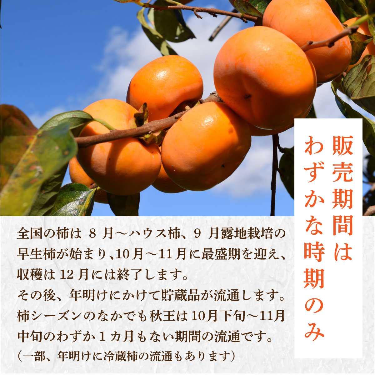 全国の柿の最盛期は10月〜11月ですが、「秋王」が出回るのは10月下旬〜11月中旬のわずかな期間。 その後は一部、年明けに冷蔵貯蔵品が出回るのみで、まさに“旬の一瞬”を味わえる貴重な柿です。