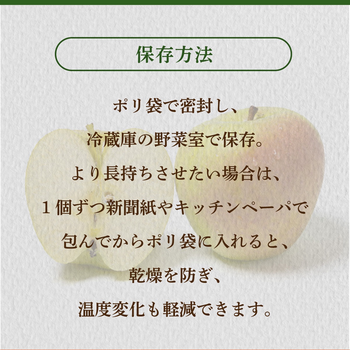 ポリ袋で密封し、冷蔵庫の野菜室で保存。 より長持ちさせたい場合は、1個ずつ新聞紙やキッチンペーパで包んでからポリ袋に入れると、乾燥を防ぎ、温度変化も軽減できます。