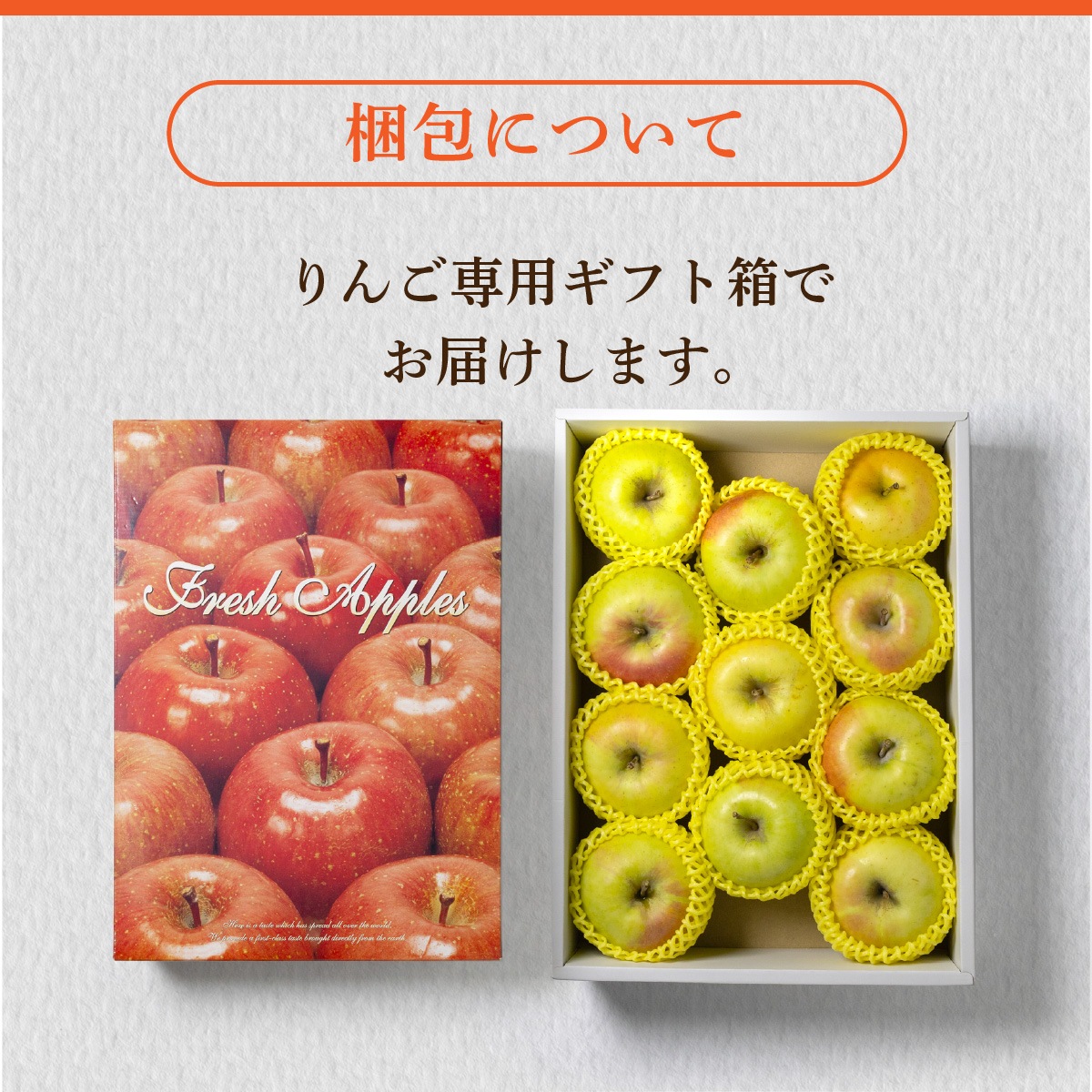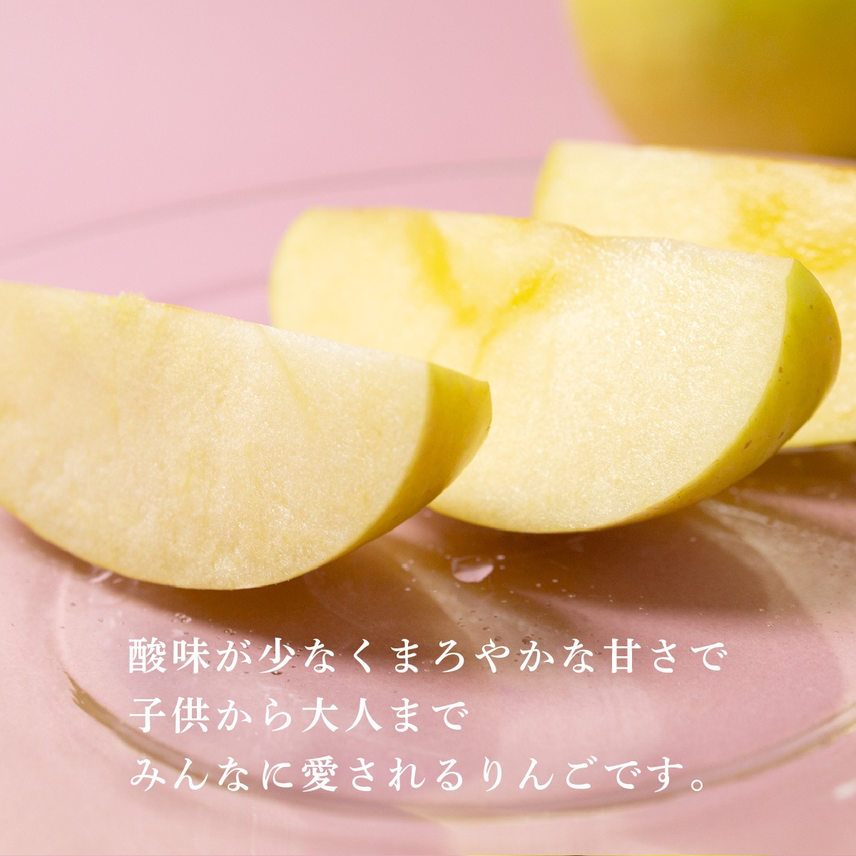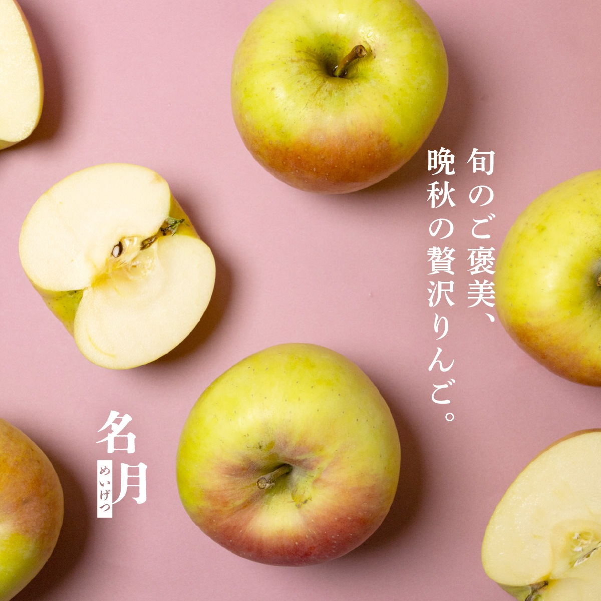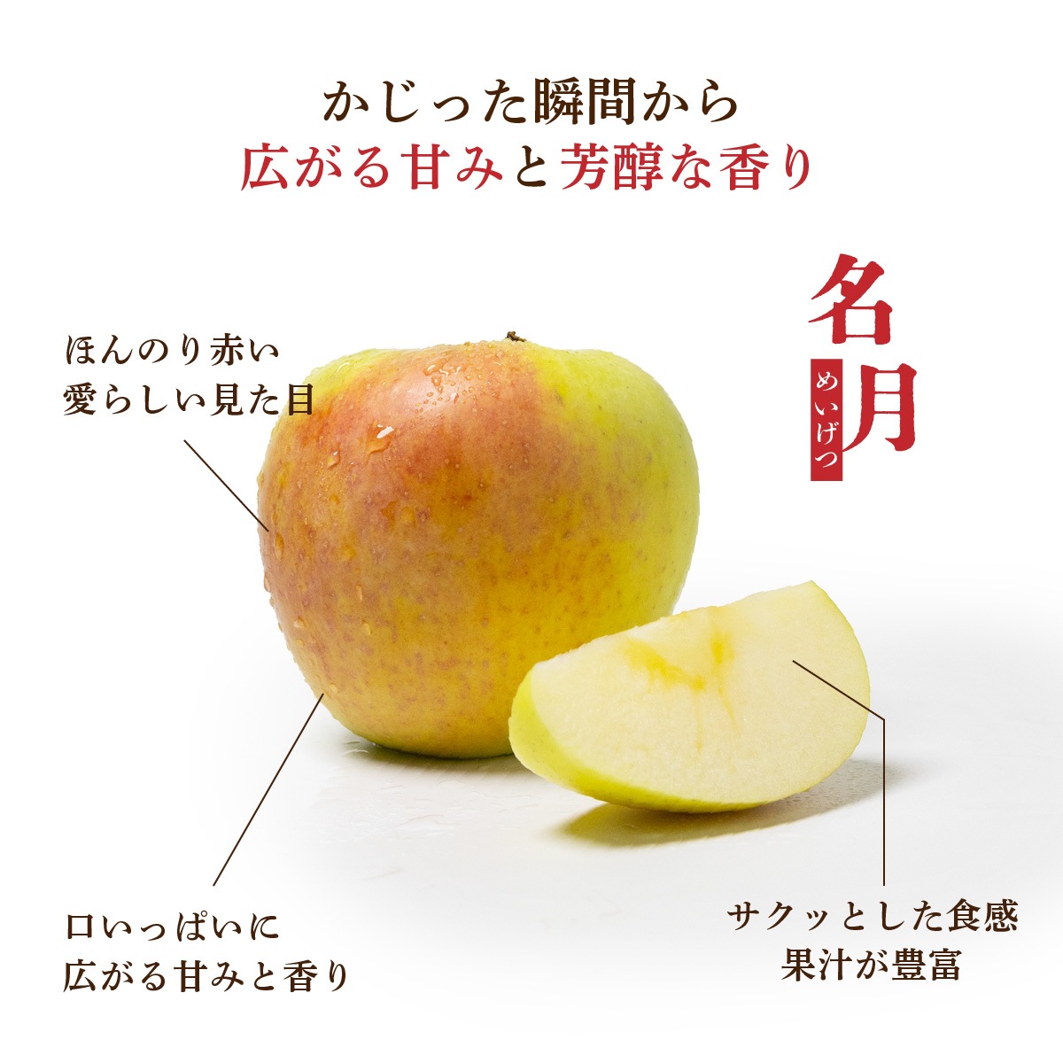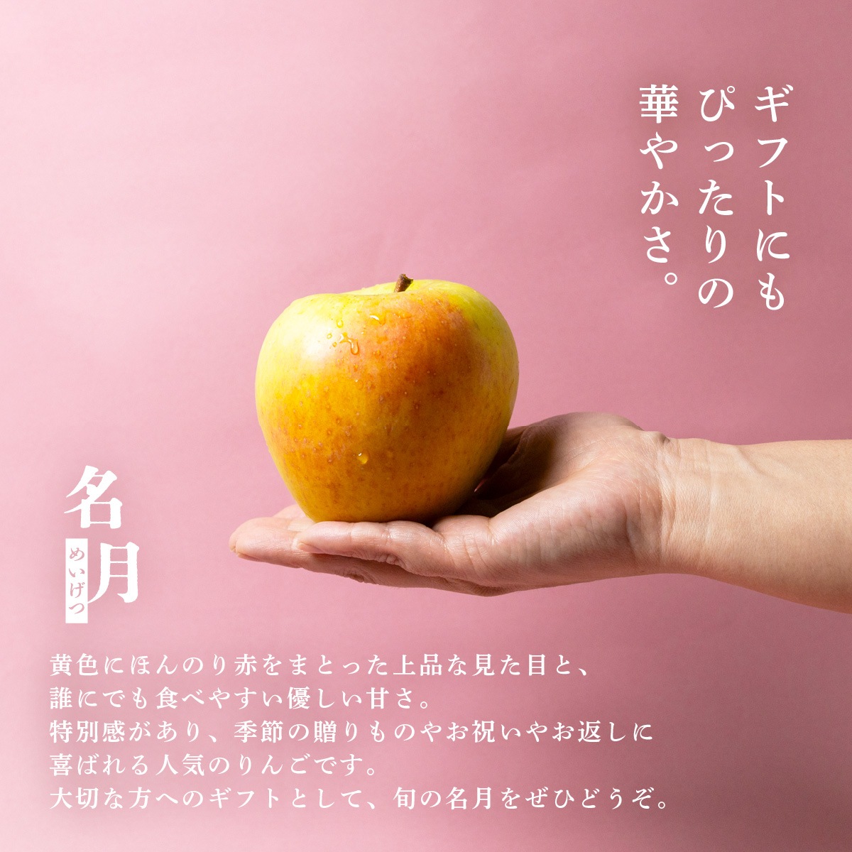 黄色にほんのり赤をまとった上品な見た目と、誰にでも食べやすい優しい甘さ。 特別感があり、季節の贈りものやお祝いやお返しに喜ばれる人気のりんごです。 大切な方へのギフトとして、旬の名月をぜひどうぞ。