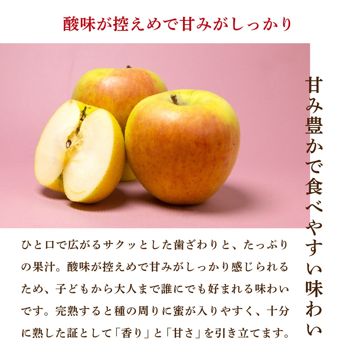 ひと口で広がるサクッとした歯ざわりと、たっぷりの果汁。酸味が控えめで甘みがしっかり感じられるため、子どもから大人まで誰にでも好まれる味わいです。完熟すると種の周りに蜜が入りやすく、十分に熟した証として「香り」と「甘さ」を引き立てます。