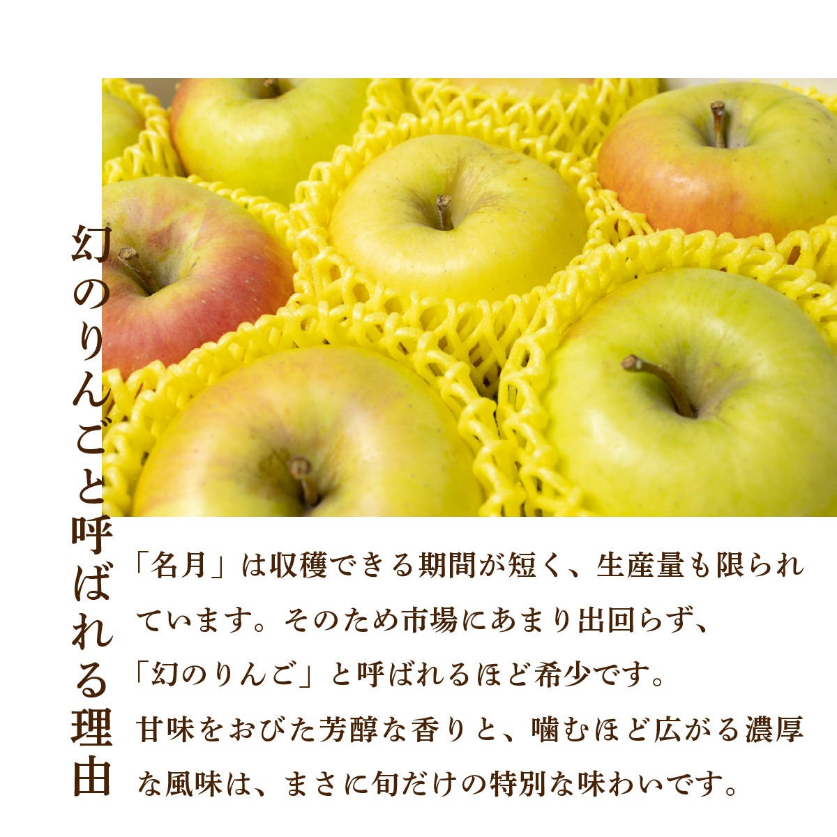 「名月」は収穫できる期間が短く、生産量も限られています。そのため市場にあまり出回らず、「幻のりんご」と呼ばれるほど希少です。 甘味をおびた芳醇な香りと、噛むほど広がる濃厚な風味は、まさに旬だけの特別な味わいです。