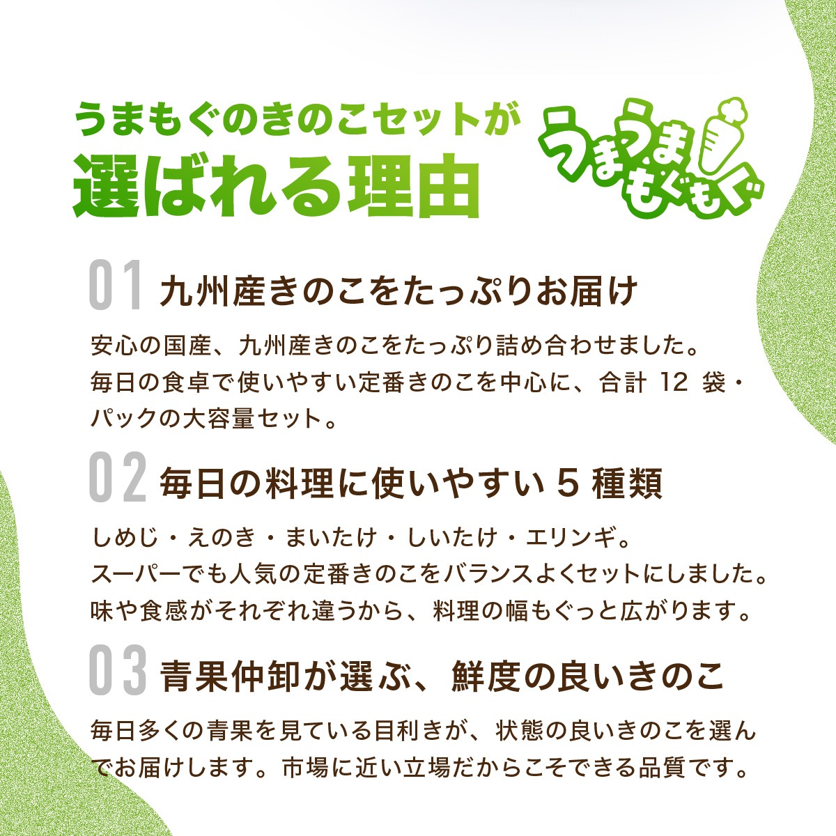 ①九州産きのこをたっぷりお届け 安心の国産・九州産きのこを中心に詰め合わせました。 毎日の食卓で使いやすい定番きのこを集め、合計12袋・パックの大容量セットに。 家族の食事はもちろん、作り置きや常備菜にもたっぷり使えます。 ②毎日の料理に使いやすい5種類 セットに入っているのは、 しめじ・えのき・まいたけ・しいたけ・エリンギの定番きのこ。 それぞれ味や食感が違うので、炒め物、鍋、炊き込みご飯、パスタなど、料理の幅がぐっと広がります。毎日の食卓で迷わず使える、使い勝手の良いセットです。