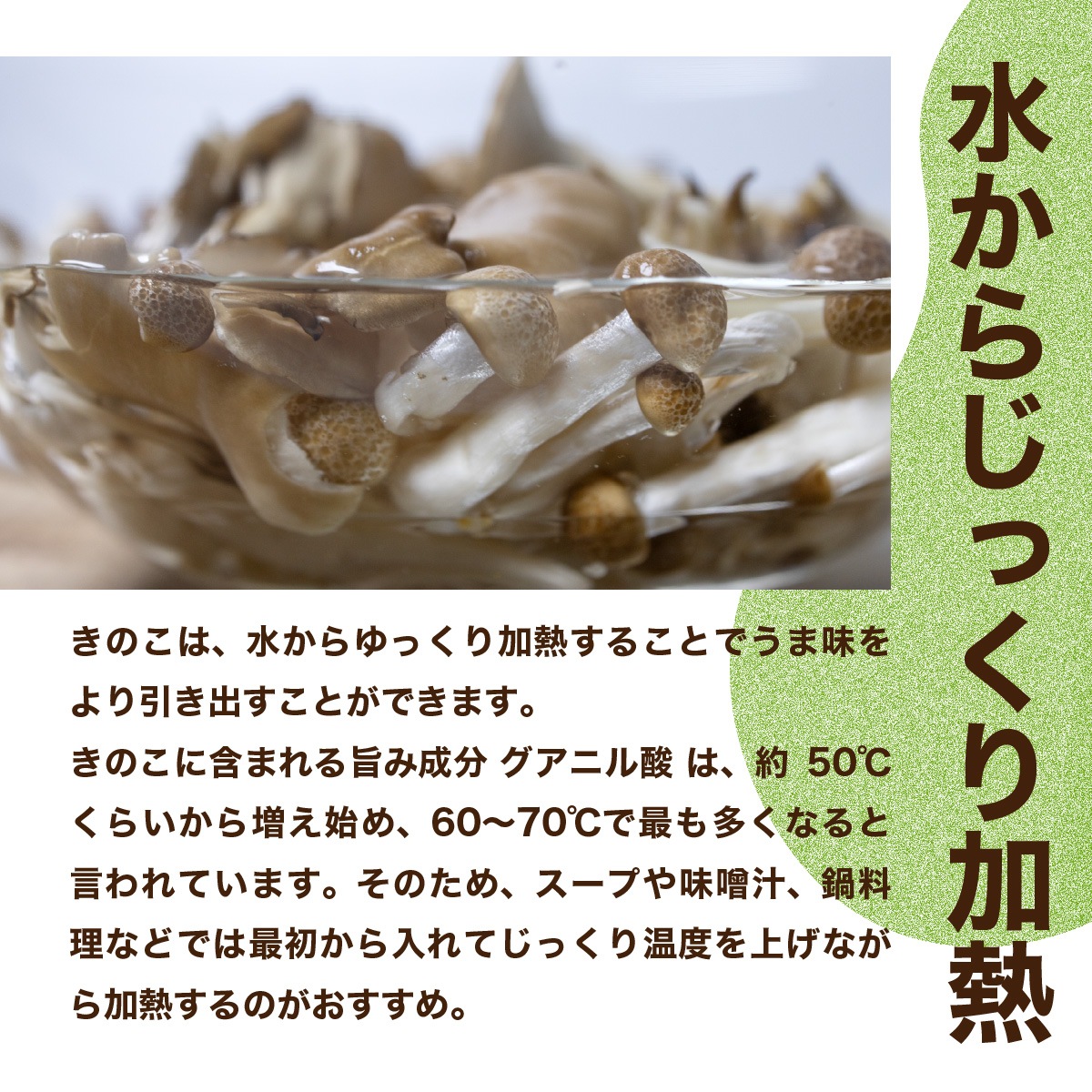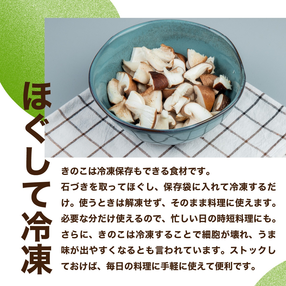 ①ほぐして冷凍保存 きのこは冷凍保存ができる便利な食材です。 石づきを取ってほぐし、保存袋に入れて冷凍するだけ。 使うときは解凍せず、そのまま料理に使えます。 必要な分だけ使えるので、忙しい日の時短料理にもおすすめ。 冷凍することで細胞が壊れ、うま味が出やすくなるとも言われています。 ②水からじっくり加熱する きのこは、水からゆっくり加熱するとうま味がより引き出されると言われています。 スープや味噌汁、鍋料理では、最初から入れてじっくり火を通すのがおすすめです。 ③数種類のきのこをミックスする きのこは種類によって、うま味・香り・食感がそれぞれ違います。 数種類を一緒に使うことで、料理の味わいがより深くなります。 きのこセットなら、手軽にきのこミックス料理を楽しめます。