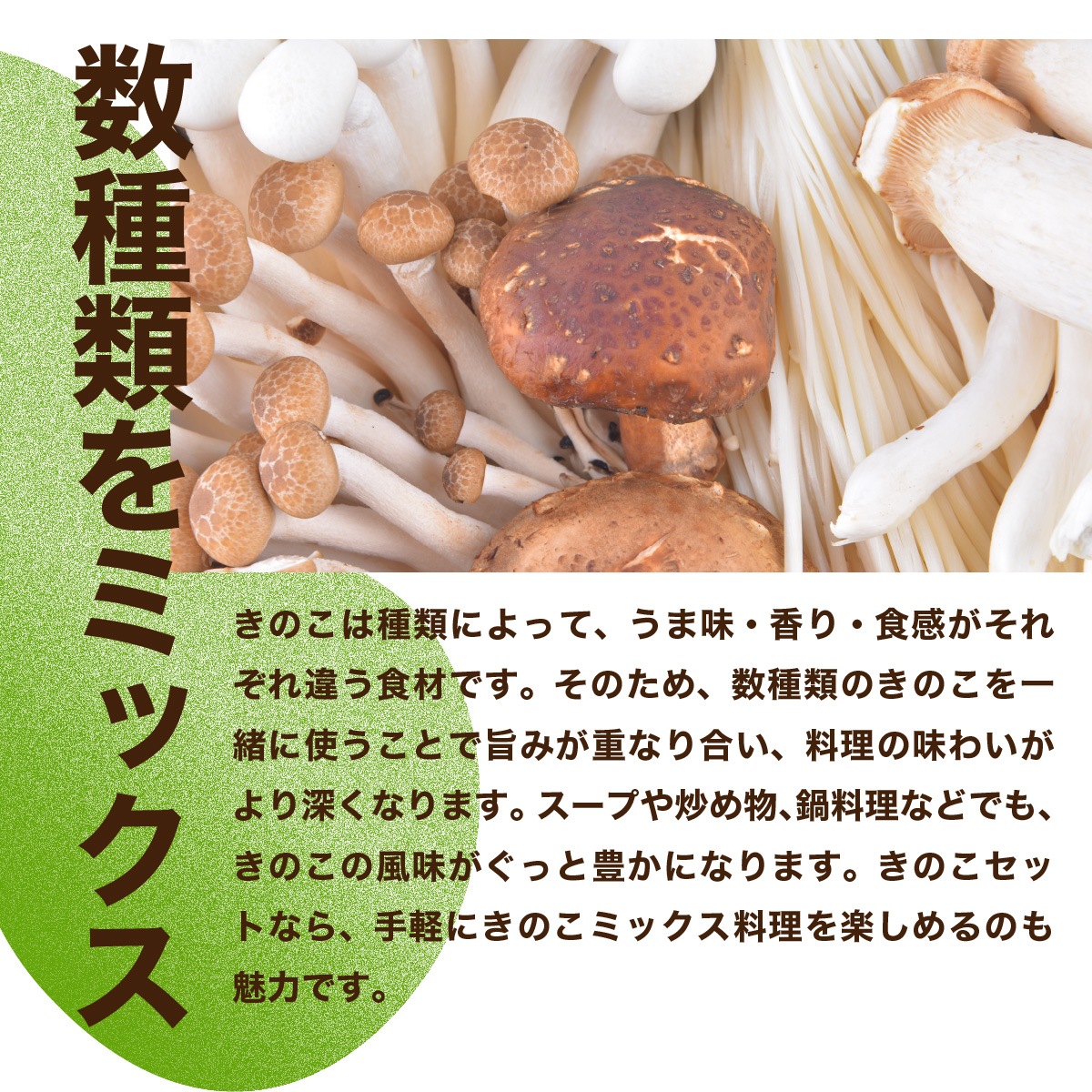 セットの中身は、普段使いしやすい定番きのこが中心。 炒め物、スープ、鍋料理など、どんな料理にもさっと使えて便利です。 冷蔵庫にあると、毎日の献立づくりにも役立ちます。