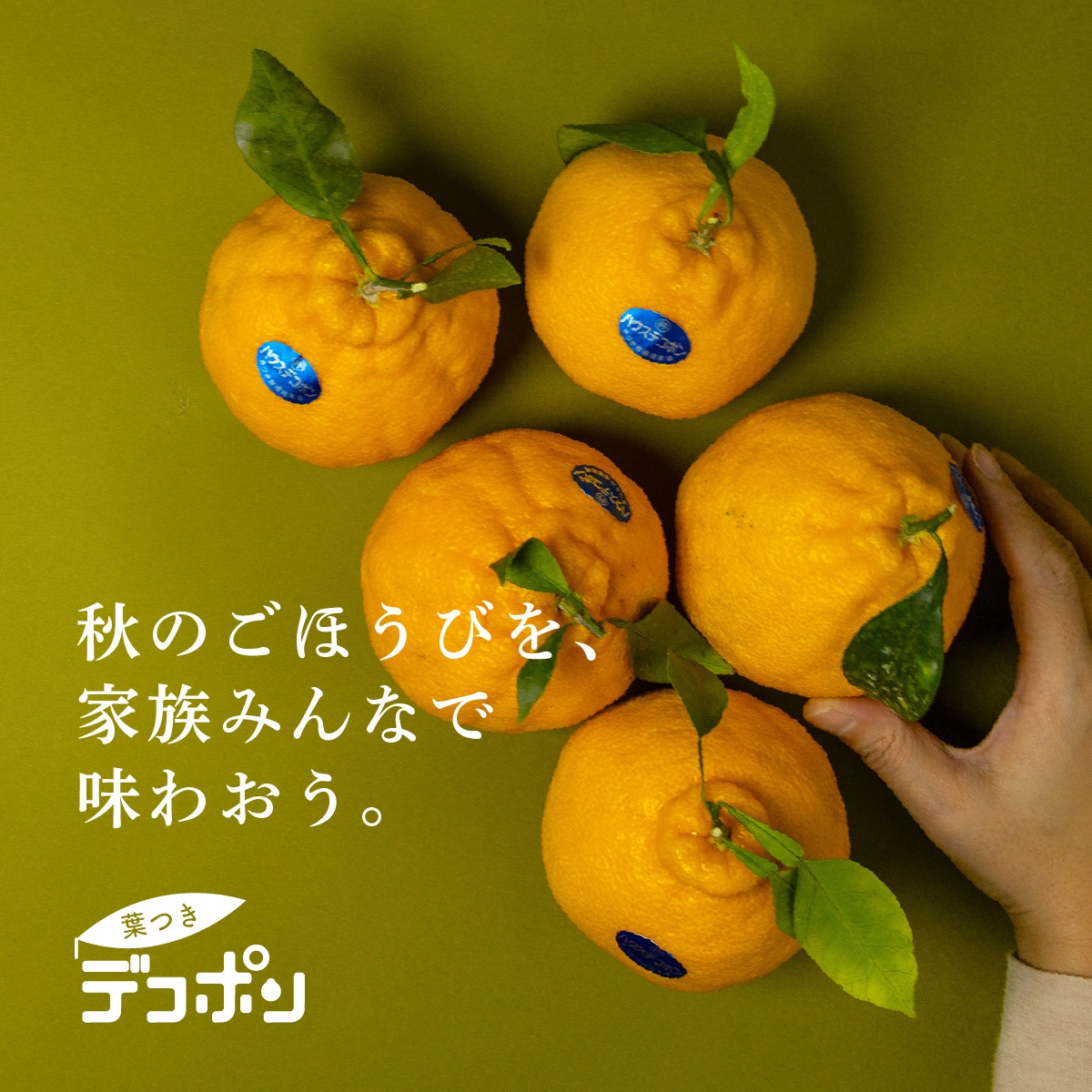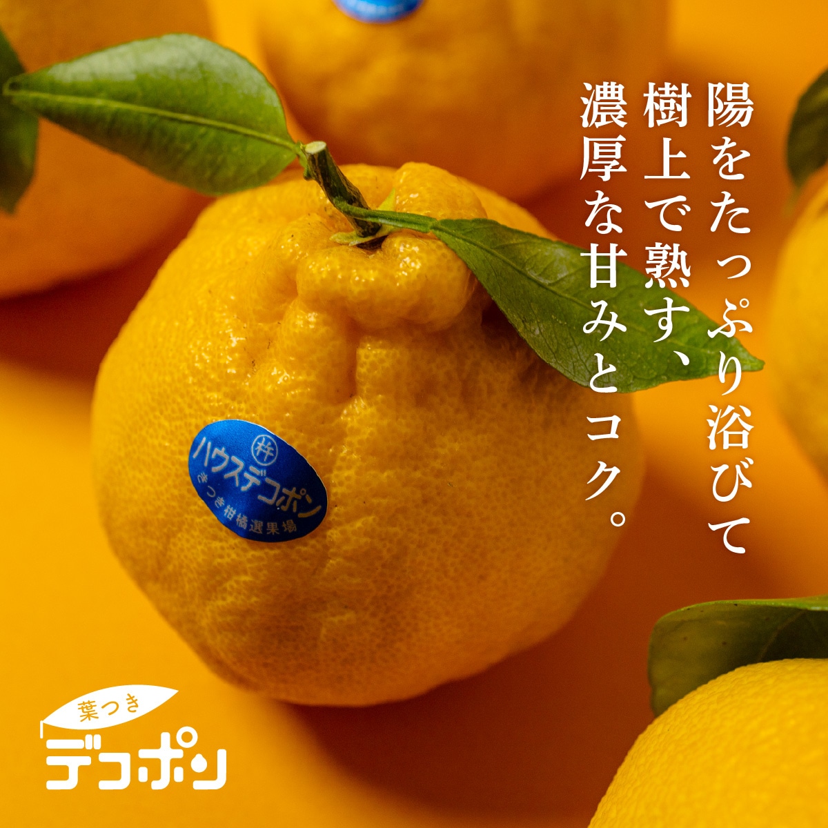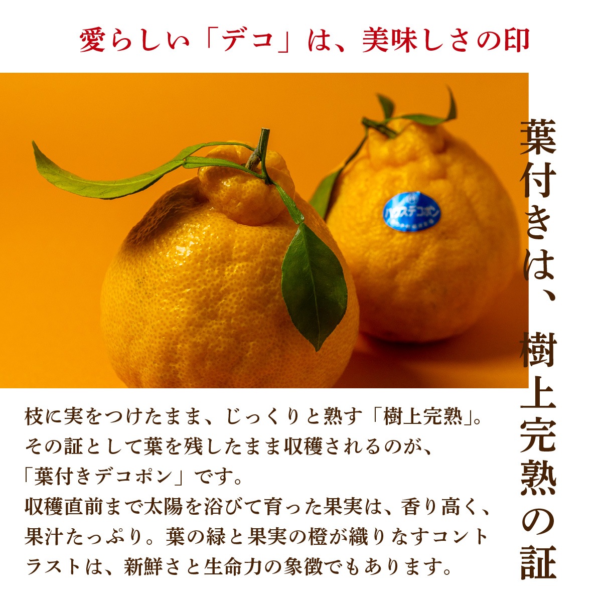 枝に実をつけたまま、じっくりと熟す「樹上完熟」。 その証として葉を残したまま収穫されるのが、 「葉付きデコポン」です。 収穫直前まで太陽を浴びて育った果実は、香り高く、果汁たっぷり。葉の緑と果実の橙が織りなすコントラストは、新鮮さと生命力の象徴でもあります。 市場でもわずかしか出回らない、希少な一級品です。