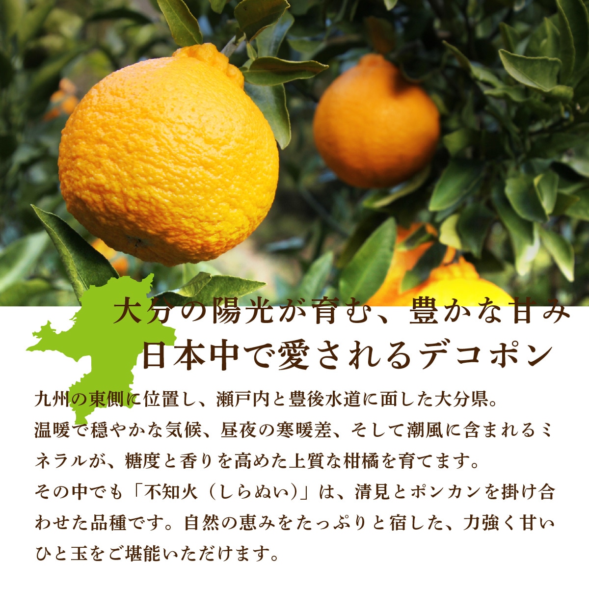 九州の東側に位置し、瀬戸内と豊後水道に面した大分県。 温暖で穏やかな気候、昼夜の寒暖差、そして潮風に含まれるミネラルが、糖度と香りを高めた上質な柑橘を育てます。 その中でも「不知火(しらぬい)」は、清見とポンカンを掛け合わせた品種です。自然の恵みをたっぷりと宿した、力強く甘い果実です。