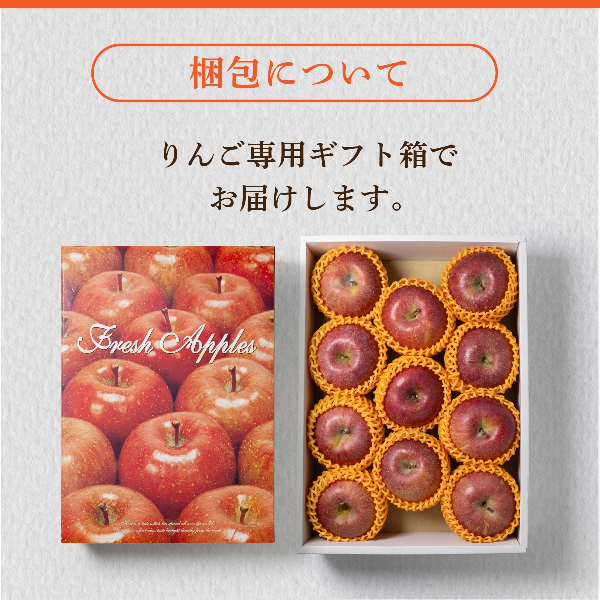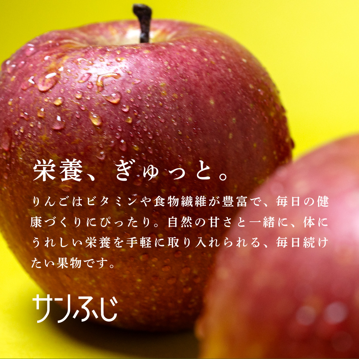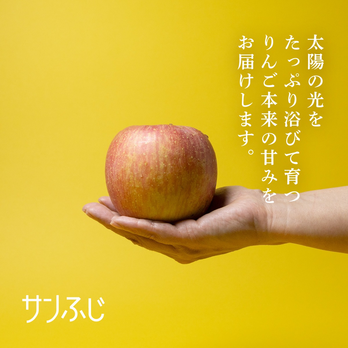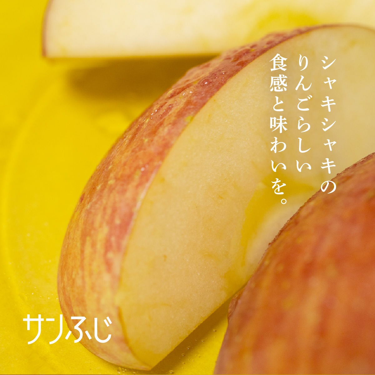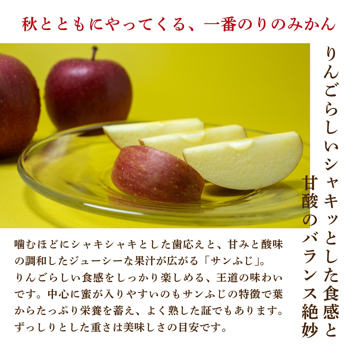 噛むほどにシャキシャキとした歯応えと、甘みと酸味の調和したジューシーな果汁が広がる「サンふじ」。 りんごらしい食感をしっかり楽しめる、王道の味わいです。中心に蜜が入りやすいのもサンふじの特徴で葉からたっぷり栄養を蓄え、よく熟した証でもあります。ずっしりとした重さは美味しさの目安です。