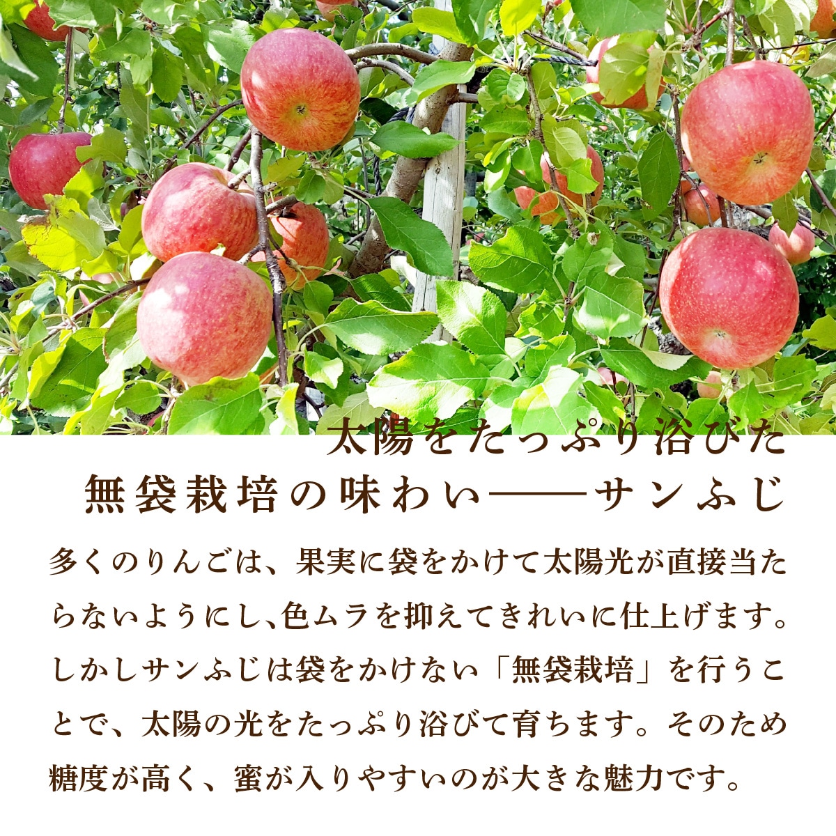多くのりんごは、果実に袋をかけて太陽光が直接当たらないようにし、色ムラを抑えてきれいに仕上げます。 しかしサンふじは袋をかけない「無袋栽培」を行うことで、太陽の光をたっぷり浴びて育ちます。そのため糖度が高く、蜜が入りやすいのが大きな魅力です。