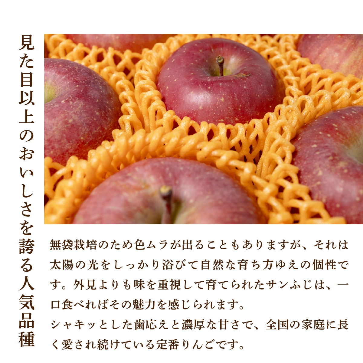 無袋栽培のため色ムラが出ることもありますが、それは太陽の光をしっかり浴びて自然な育ち方ゆえの個性です。外見よりも味を重視して育てられたサンふじは、一口食べればその魅力を感じられます。 シャキッとした歯応えと濃厚な甘さで、全国の家庭に長く愛され続けている定番りんごです。