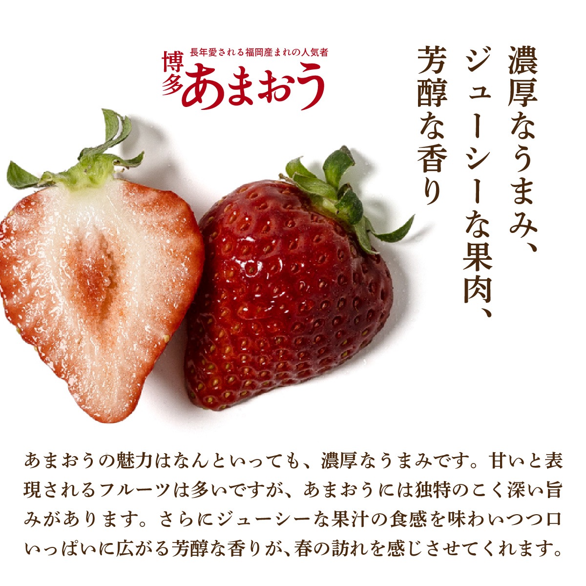 あまおうの最大の魅力は、ただ「甘い」だけではない、濃厚でコクのあるうまみ。 一口かじると、果汁がじゅわっと広がり、口いっぱいに満ちるみずみずしさ。 そのあとから追いかけてくる、芳醇で豊かな香りが、春の訪れを感じさせてくれます。 王道と呼ばれる理由は、誰が食べても「美味しい」と感じられる、完成度の高さ。 いちごらしい甘さと、食べごたえのある果肉感を楽しみたい方に、ぜひ味わっていただきたい一粒です。