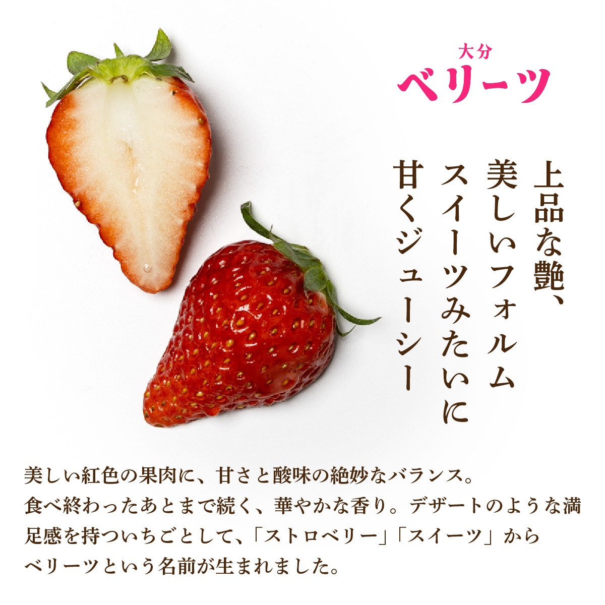 宝石のように美しい紅色の果肉。つややかで整ったフォルムは、思わず見とれてしまうほど。 ベリーツの魅力は、甘さと酸味のバランスの良さと、食べ終わったあとまで続く、華やかな香りの余韻です。 まるで上質なデザートを味わったあとのような、満足感と幸福感。 「ストロベリー」と「スイーツ」を掛け合わせて名付けられたその名の通り、スイーツ感覚で楽しめるいちごです。