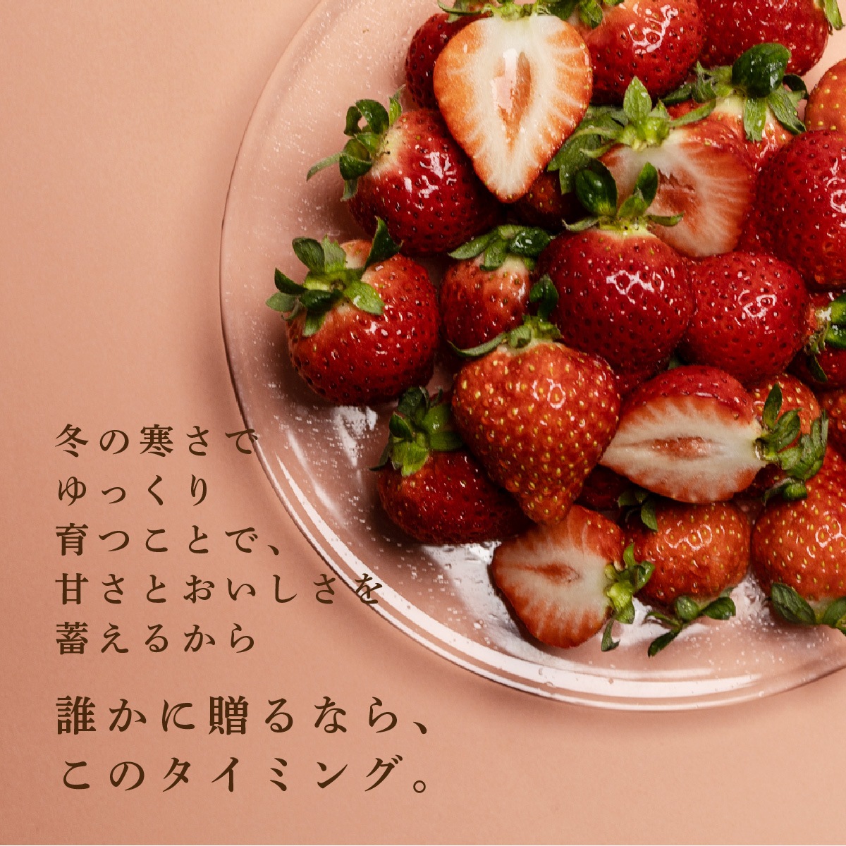 冬の寒さの中で、ゆっくりと育つことで、甘さと美味しさをぎゅっと蓄えたいちごだからこそ、今いちばん美味しい状態でお届けします。