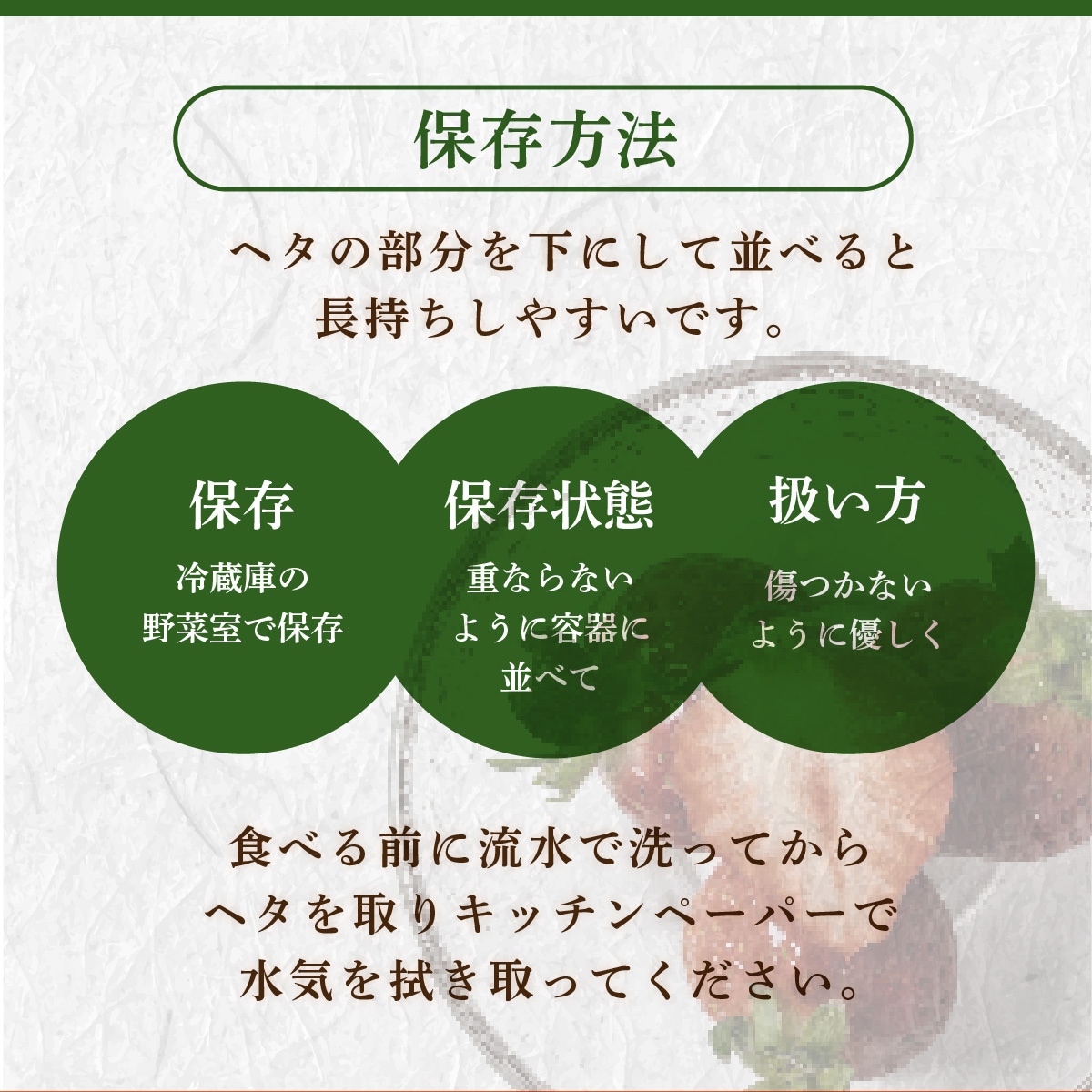 ◾️冷蔵庫の野菜室で保存してください ◾️重ならないように容器に並べるのがおすすめです ◾️果実はとてもデリケートなため、優しく取り扱ってください